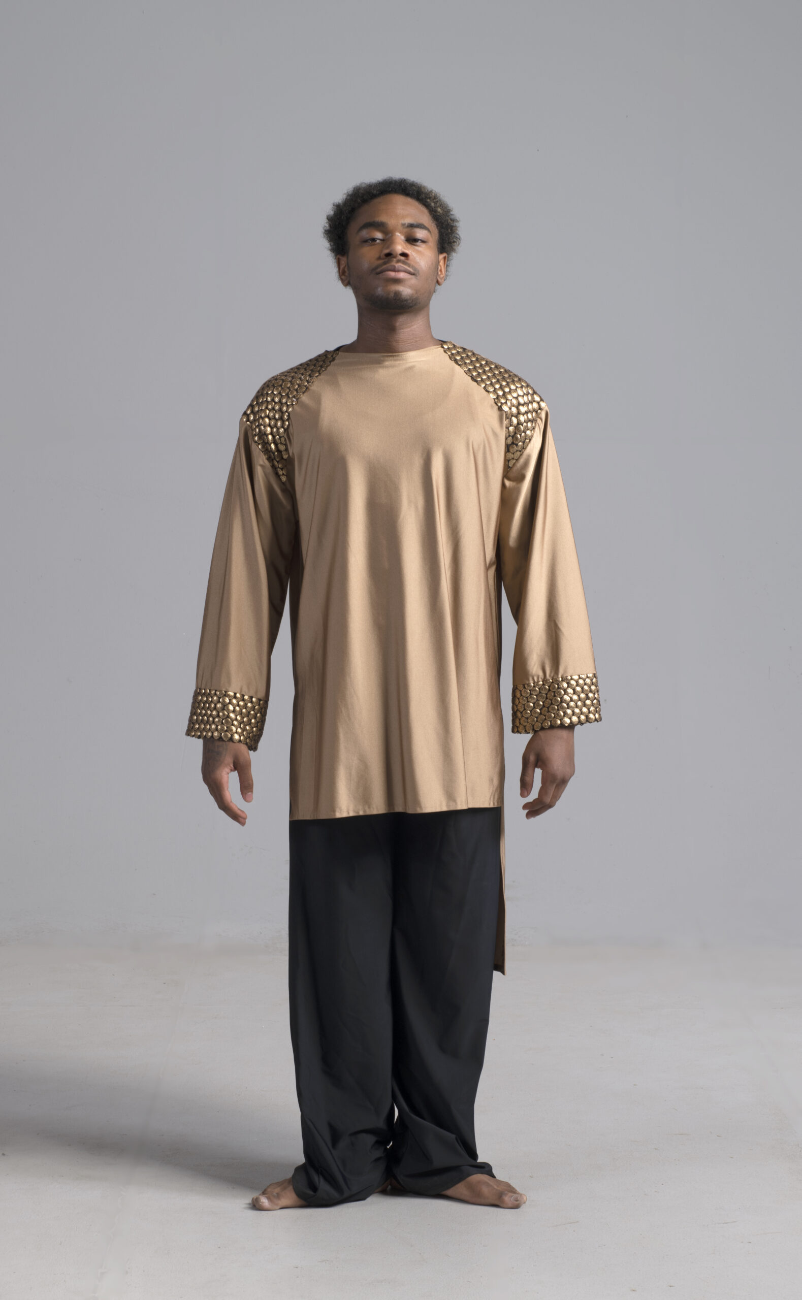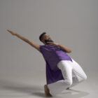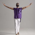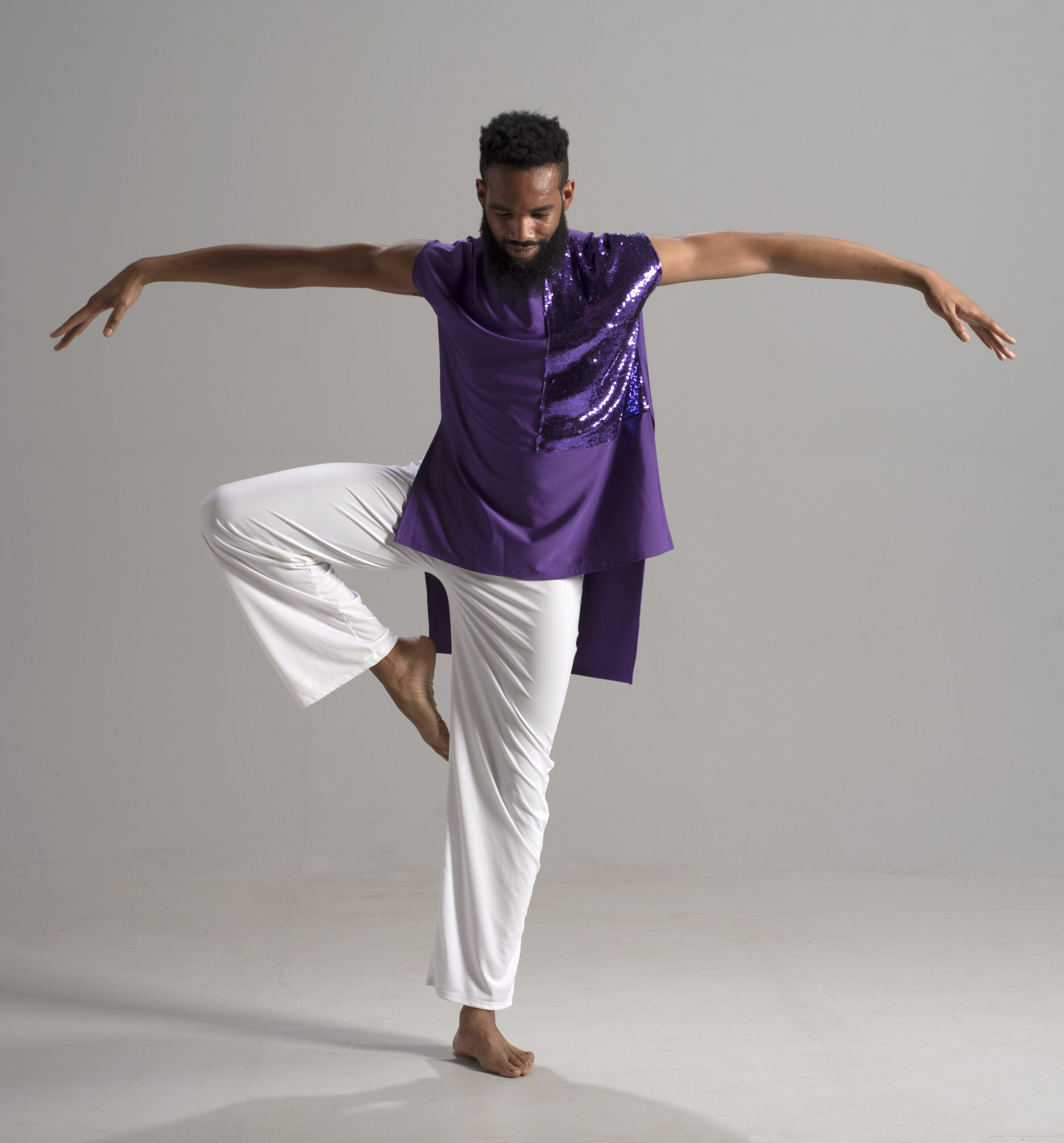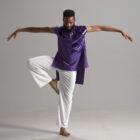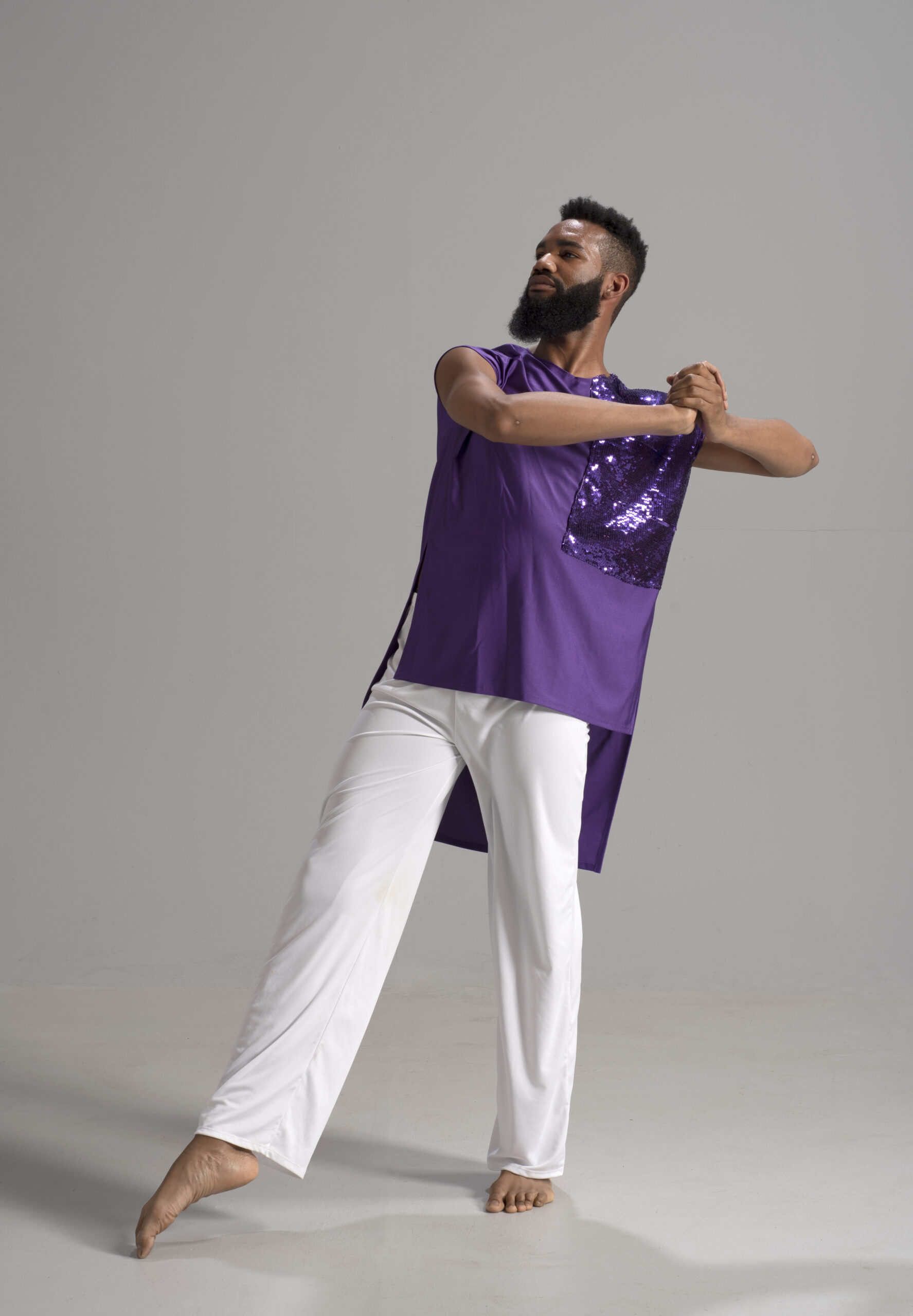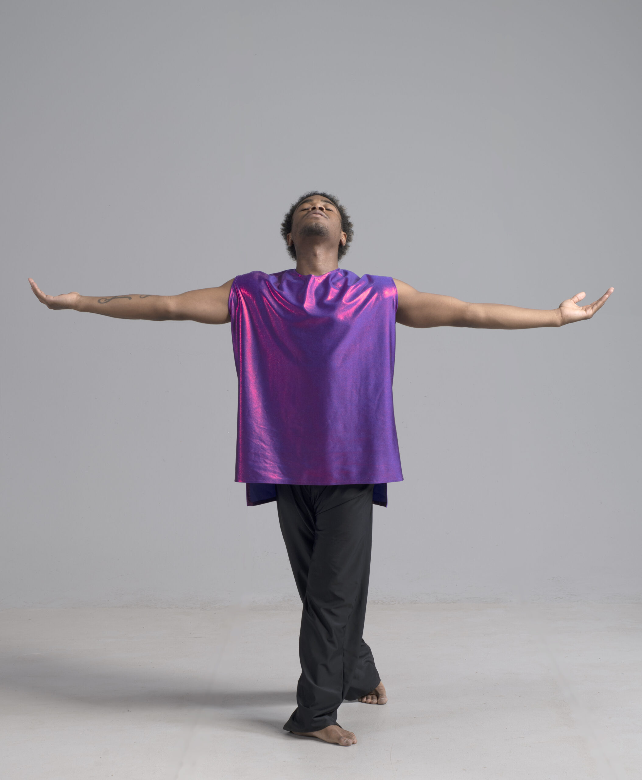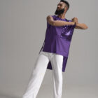 Soar in a sleeveless short/long accented unisex top. Our fabrics are exquisite and rich in color, shown in deep purple.
