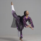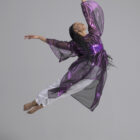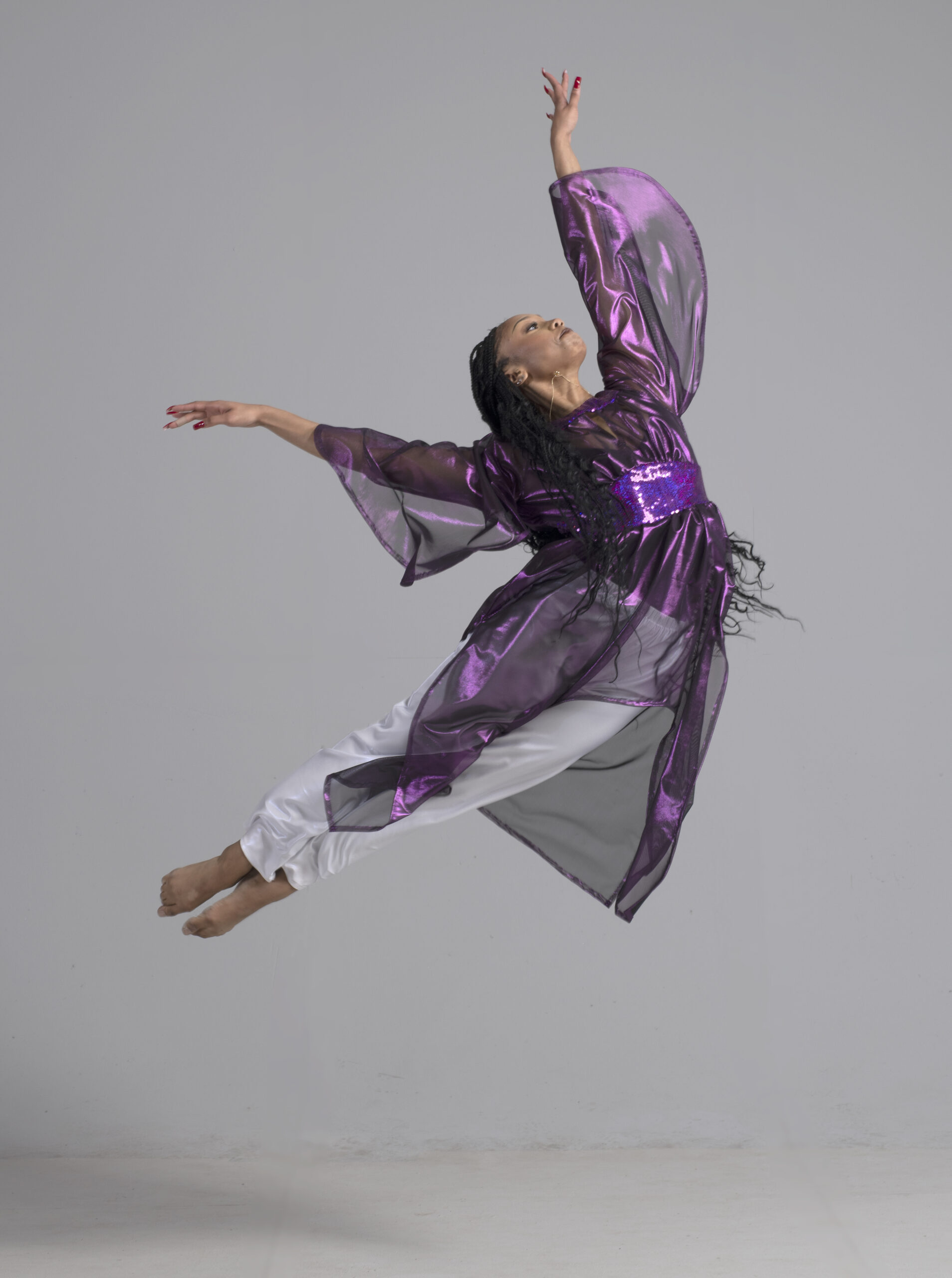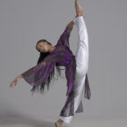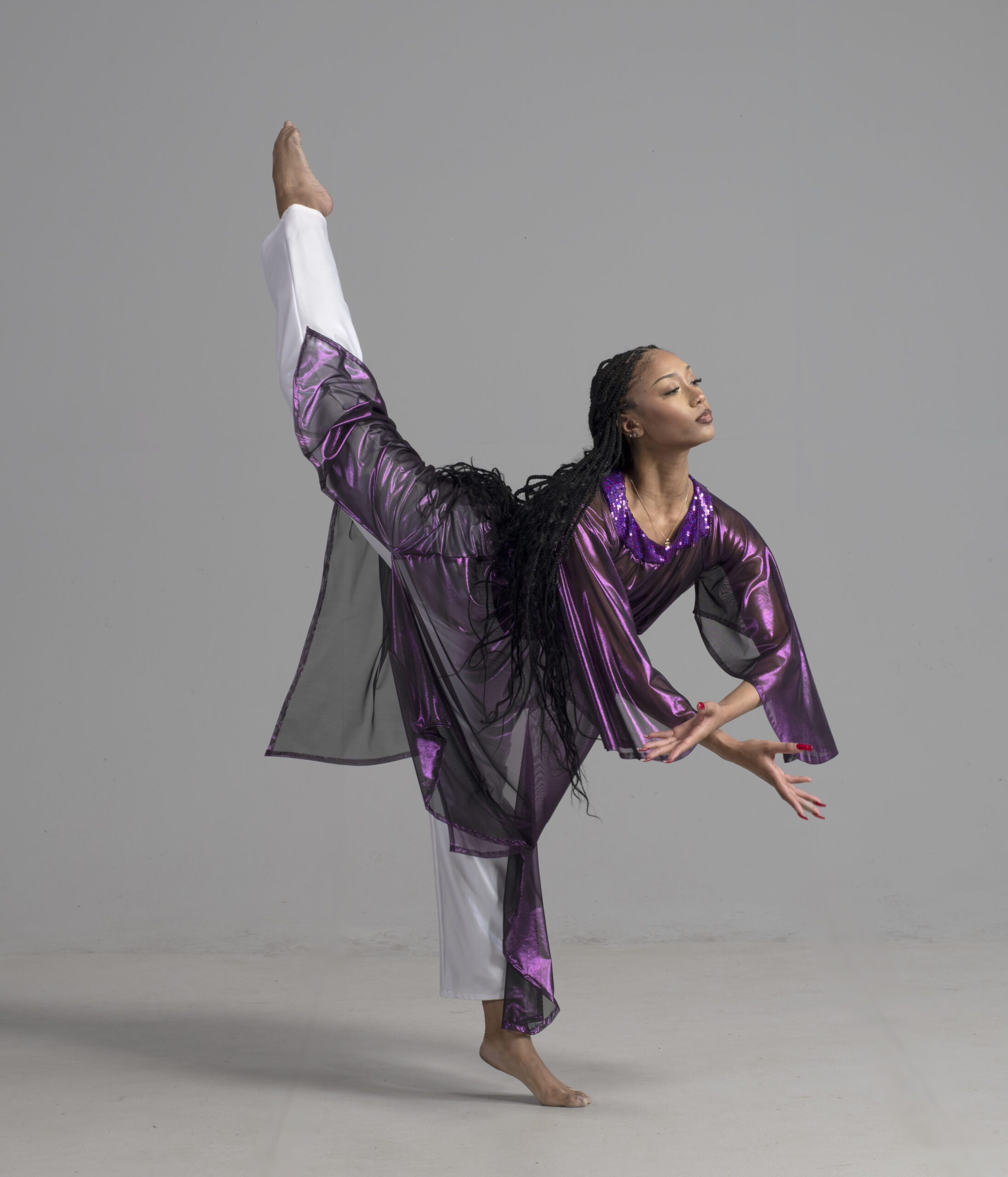 Best seller Asymmetrical Dance Dress shown in a sheer metallic deep purple with a touch of sequin.