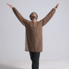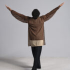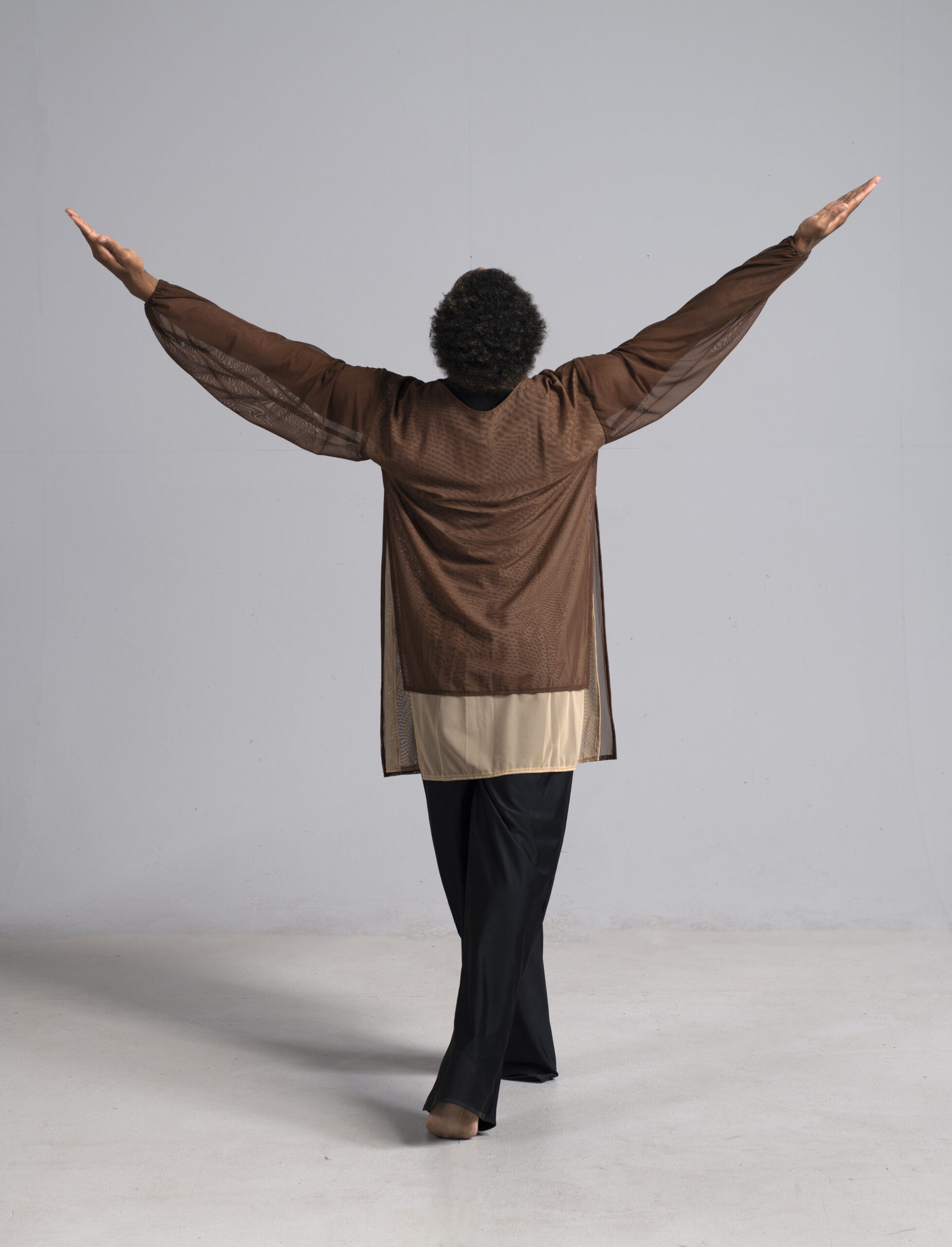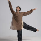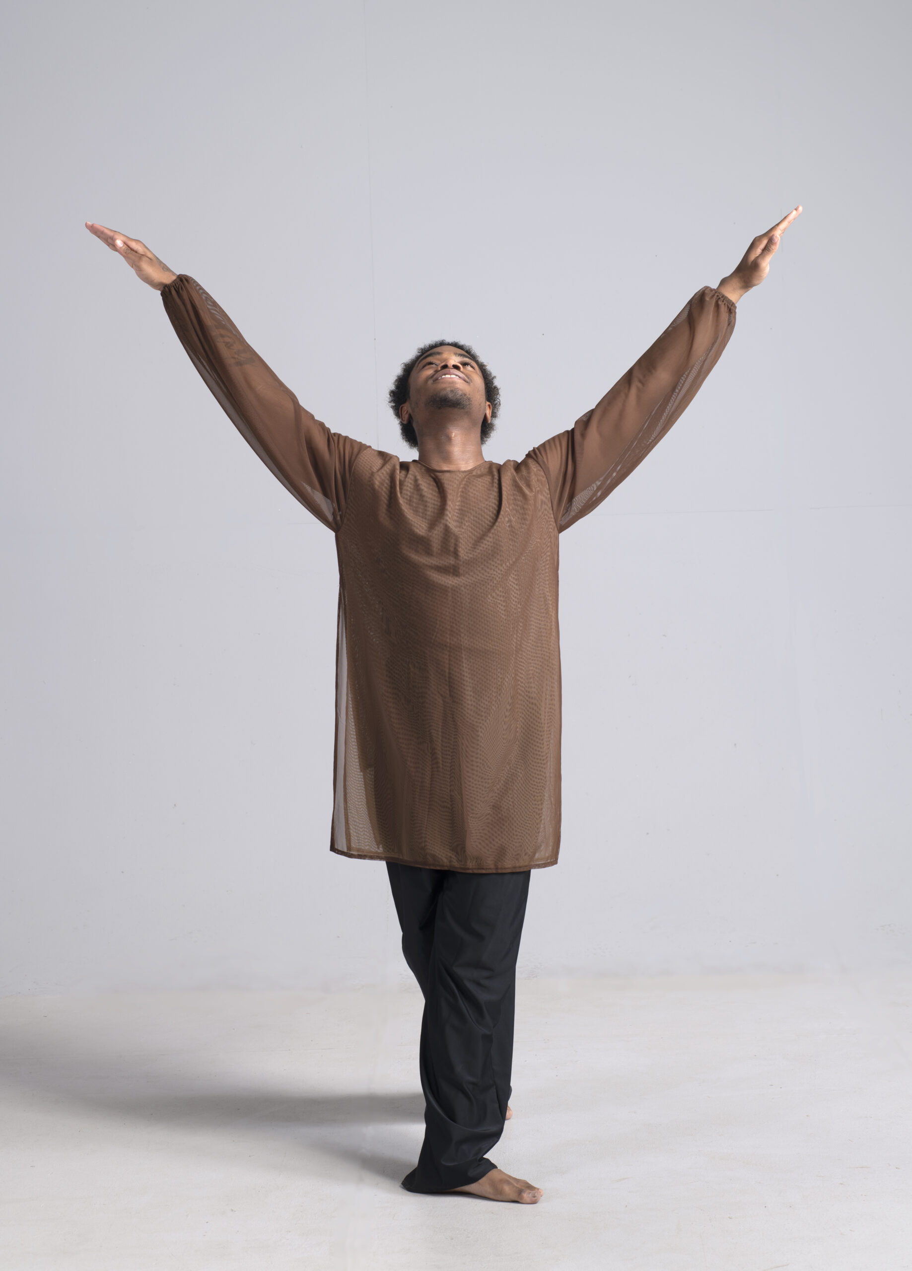 Men’s dance long sleeve asymmetric top shown in a double-sheer chocolate and nude. Available in other custom colors.