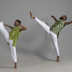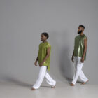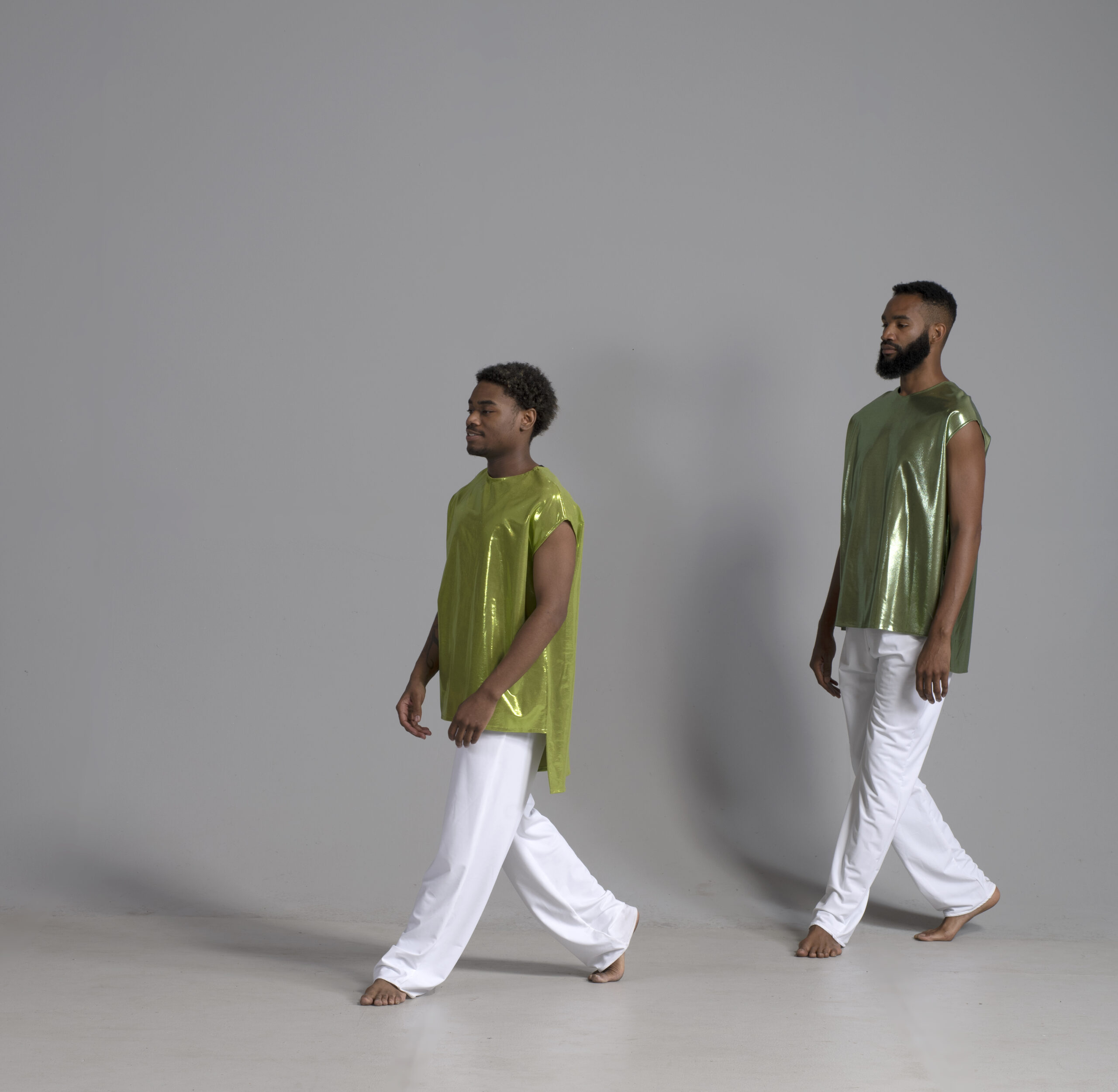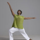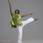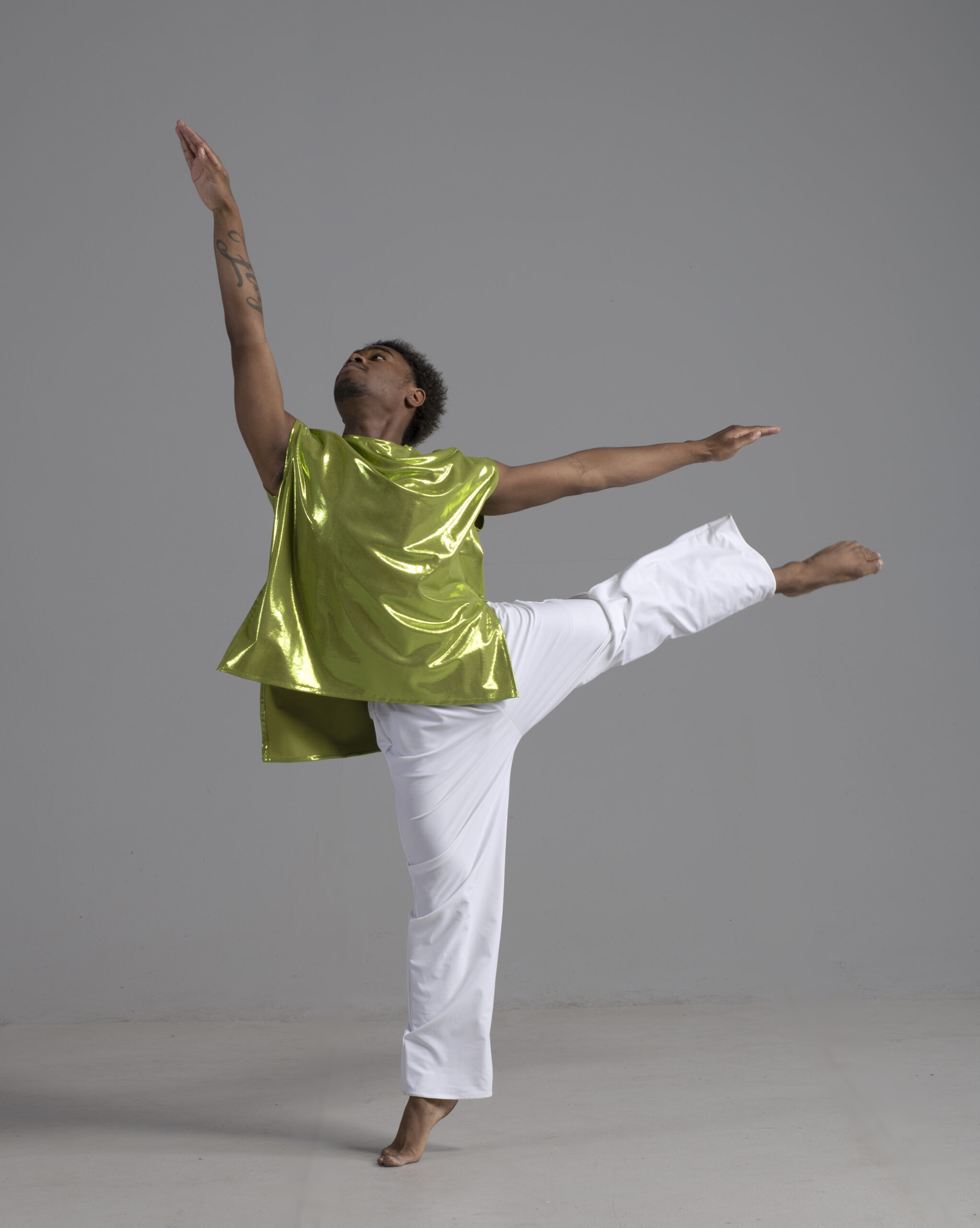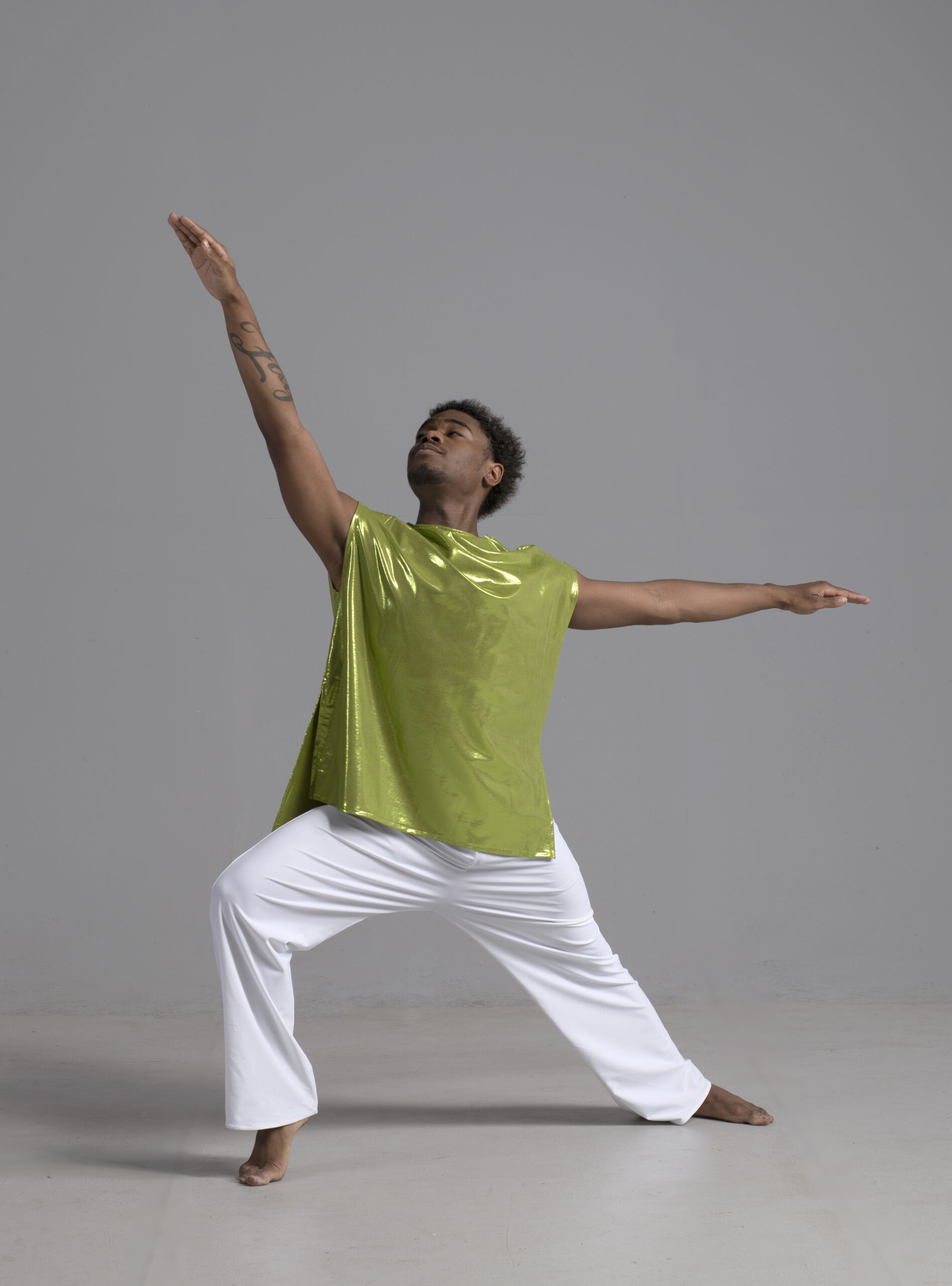 Men’s dance asymmetric top shown in a metallic chartreuse.