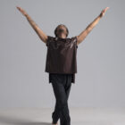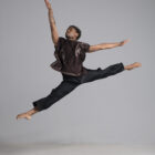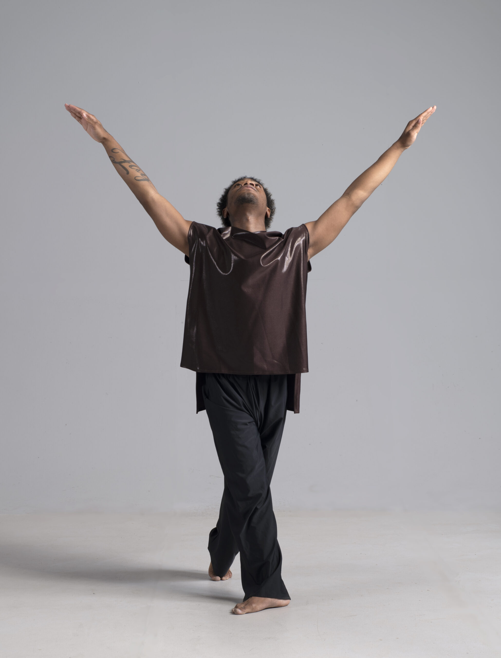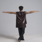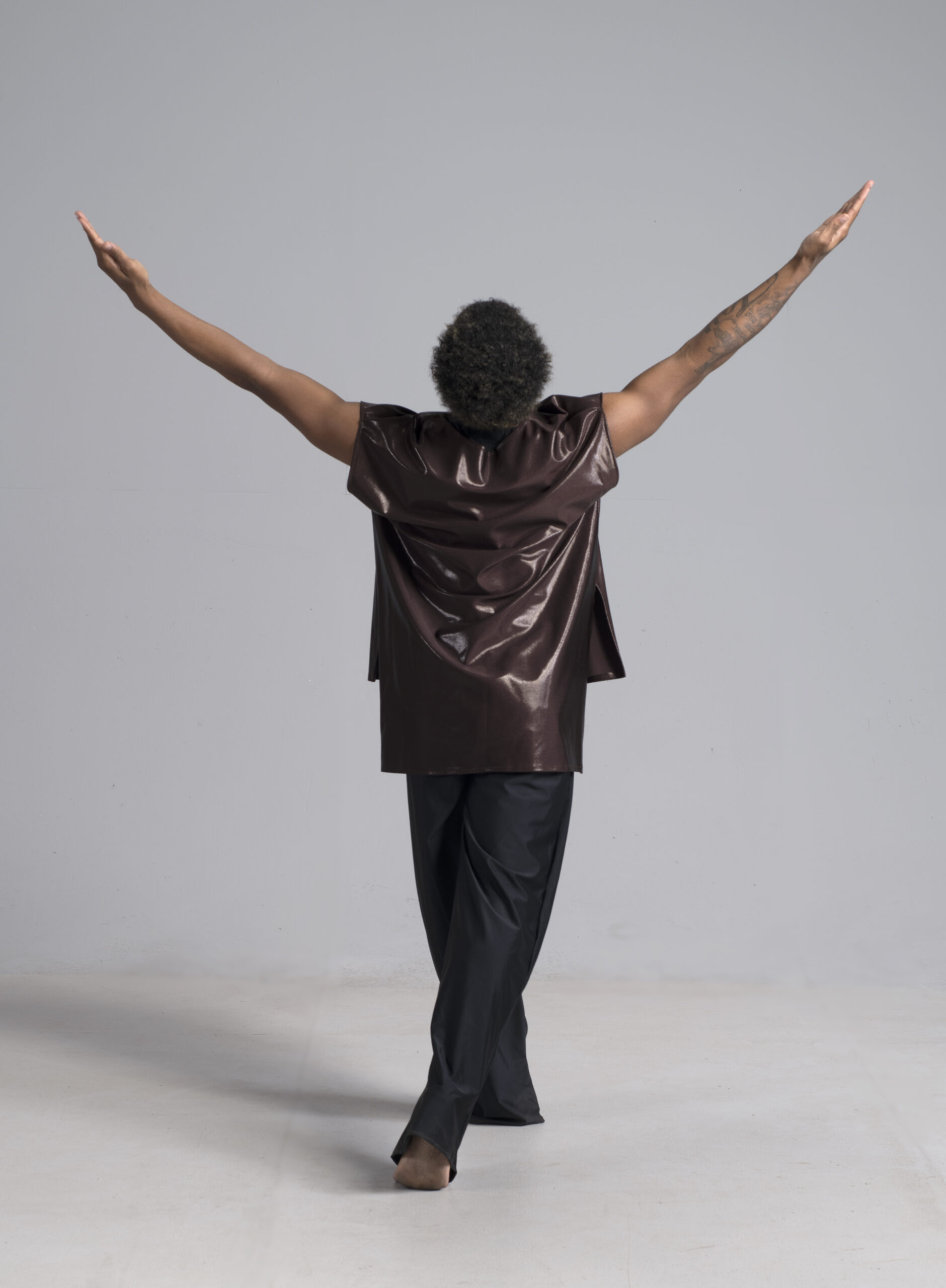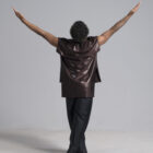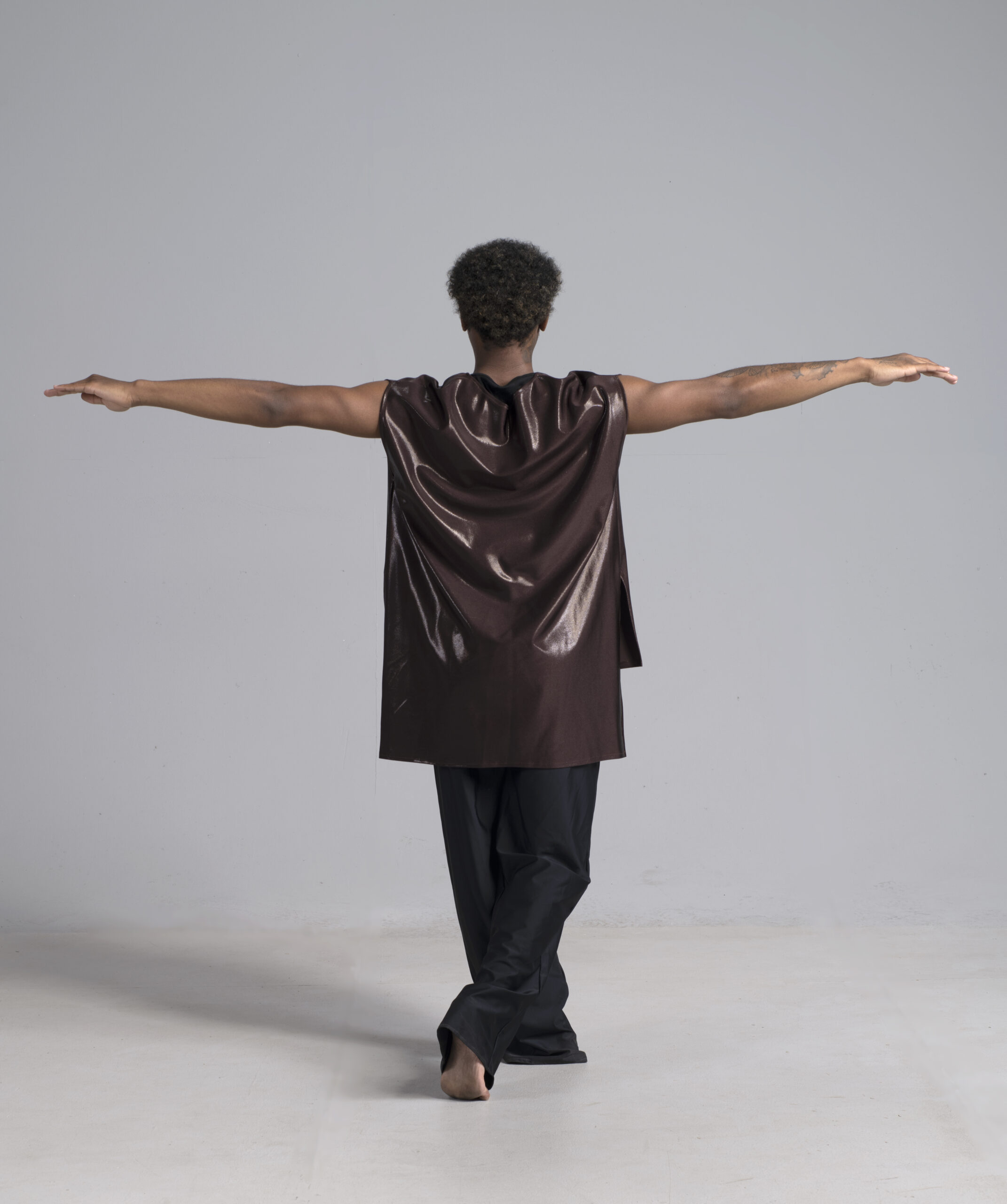 Men’s dance asymmetric top shown in a rich metallic chocolate.