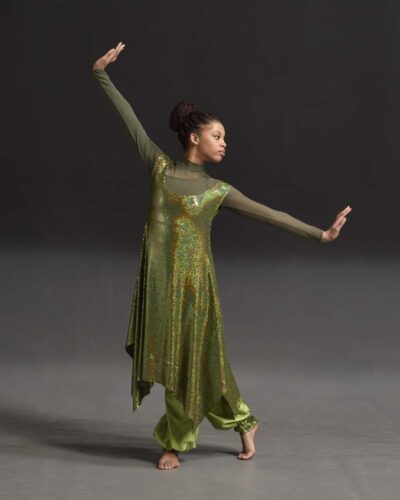 It’s a Rich Metallic Dance Tunic shown in Chartreuse.